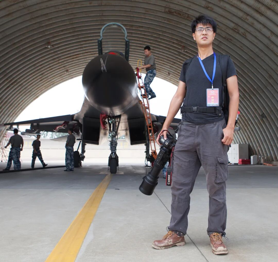 中国航空报摄影记者岳书华在2015年庆祝抗战胜利70周年阅兵前的留影。