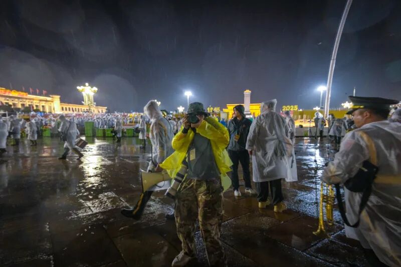 第一次阅兵彩排时,我的心情紧张到了极点。不仅位置未知,还预报有雨。我除了给自己准备雨衣,还给设备置备了三套雨具。50斤的摄影设备扛在肩上,心里既担心安检不让带,又害怕少带了设备拍不好。第二次彩排,我赶紧购置了梯子,希望能获得更好的拍摄角度。第三次彩排,过了安检我就拼命往点位冲,可没想到位置被灯柱、音箱挡着,无奈之下,我又扛着梯子、相机四处寻找合适的角度,只为了能在规定时间内将这珍贵的瞬间完美地拍摄下来。