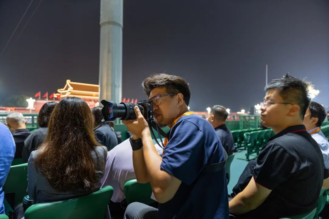 9月3日凌晨零点,我到了集合点。根据最新规定,我所在的位置是文字记者区域,没有专门的拍摄位置,太大的摄影器材也不能入场。于是我精心挑选了12-24毫米、24-105毫米镜头用来拍摄现场观众和机群,100-400毫米镜头拍摄地面装备。出发前,我仔细检查了一遍设备,通过层层安检后乘车到达指定区域。中国记协、行业报协会和主办方非常贴心地准备了餐包、雨披、国旗和饮料等保障物资,让我们能够全身心地投入工作。