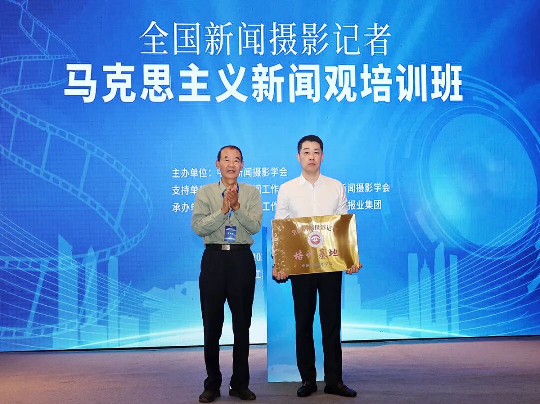 中国新闻摄影学会书记赵建伟(左)向无锡日报报业集团党委书记、总裁(社长)朱敏颁发“全国新闻摄影记者培训基地”牌匾。无锡日报记者敖翔 摄