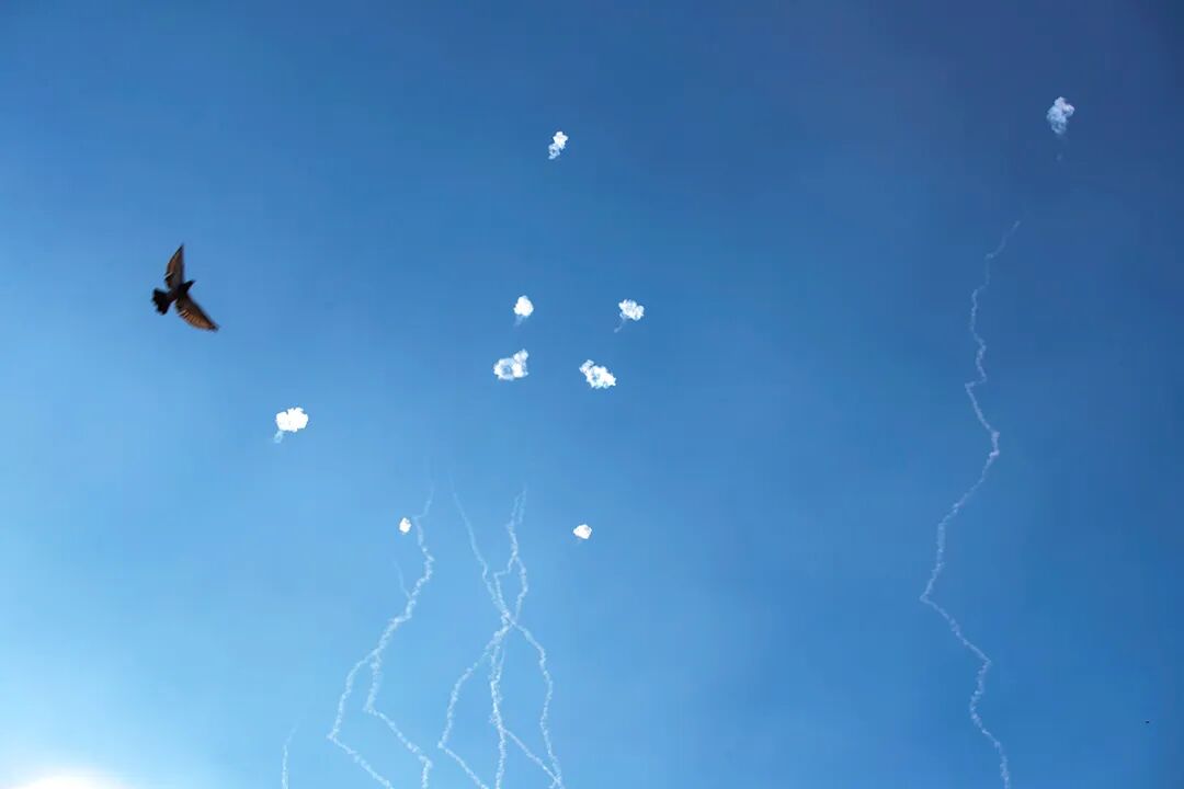 2024年9月26日,在以色列北部塞费德,火箭弹被以色列防空系统拦截后留下烟轨。对全球热点新闻的摄影报道覆盖能力是世界性通讯社话语权的重要标志。 新华社记者 陈君清 摄