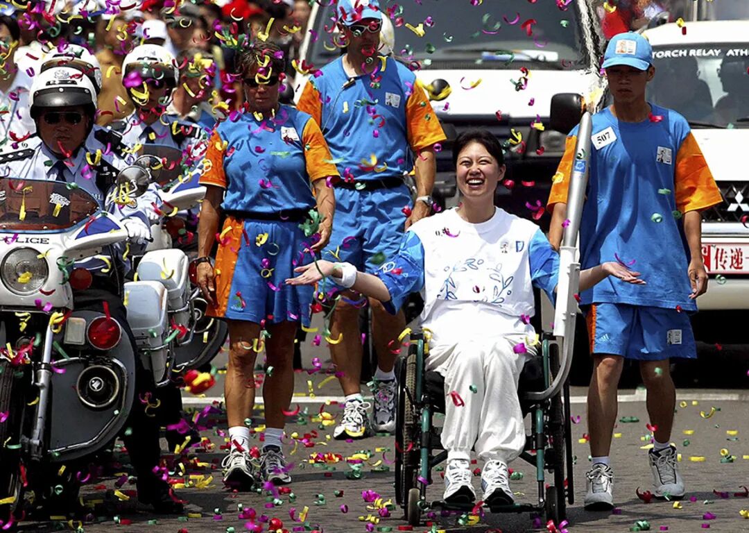 2004年6月9日,雅典奥运火炬传到北京,我有幸乘坐国际奥委会的拍摄车全程采访奥运火炬的传递过程。那一天,北京万众欢腾,被奥运精神所感染,百万群众沿途自发参与到这项活动中。著名残疾运动员齐凯丽作为火炬手参与了这一神圣的仪式。当她坐着轮椅护送火炬行走在北京的街道上时,沿途的群众施放彩花为她助兴。齐凯丽伸出双手迎接突降的“彩雨”,脸上绽开灿烂的笑容。