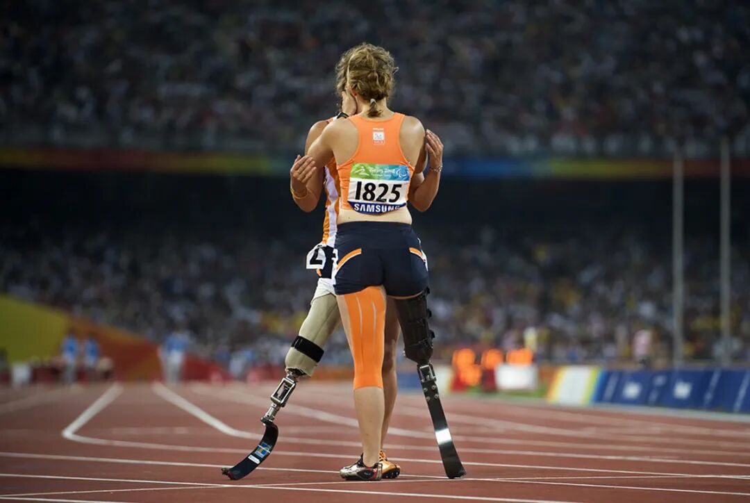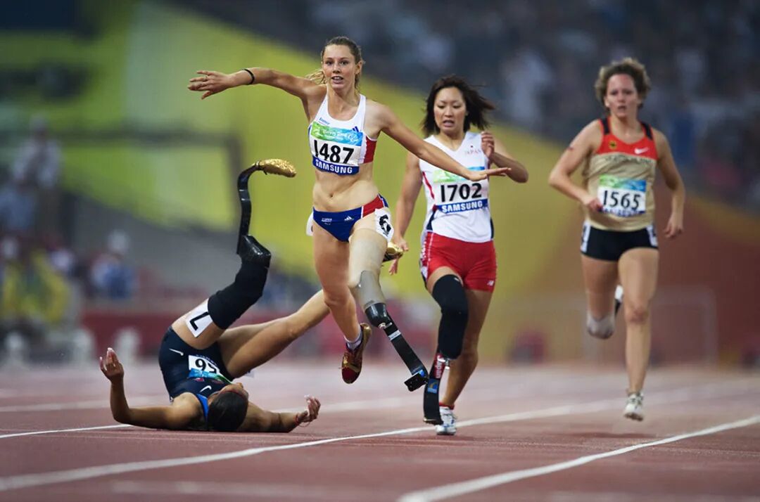 《意外失足》2008年9月9日,在北京残奥会女子200米T44级决赛中,美国选手霍姆斯不慎摔倒。身旁的法国选手菲尔躲闪不及也被绊倒在地。与奖牌失之交臂。赛后,菲尔非但没有责怪,反而安慰情绪低落的霍姆斯。这一时刻被称为残奧会中最感人的瞬间之一。