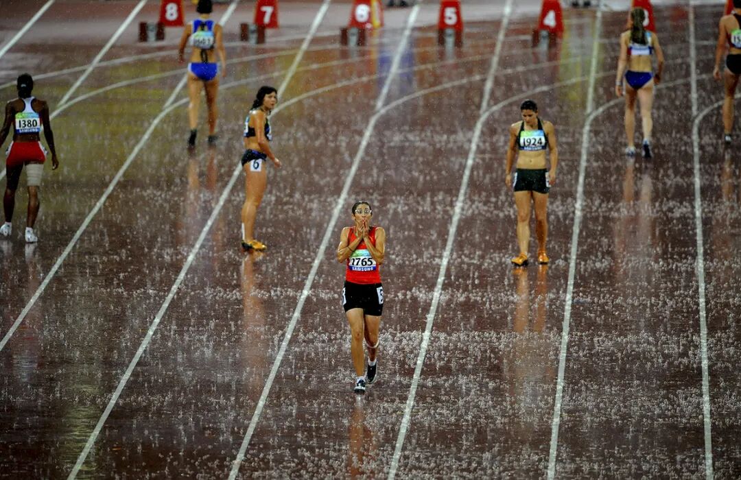 《雨中待发》2008年9月16日,北京残奥会田径女子100米T13级决赛的选手在大雨中比赛。