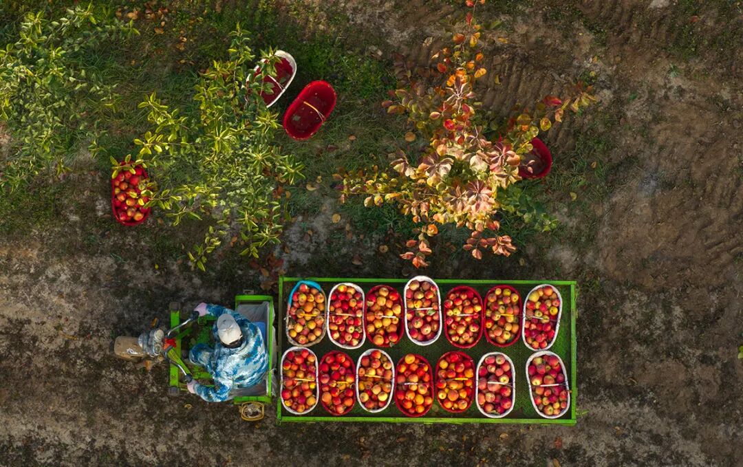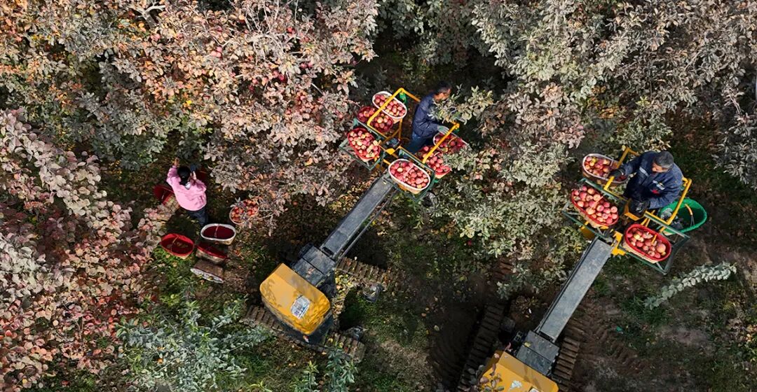 10月23日,在新疆生产建设兵团第一师阿拉尔市六团三连苹果园,林果业服务队队员运输刚采的苹果。新华社记者才扬 摄
