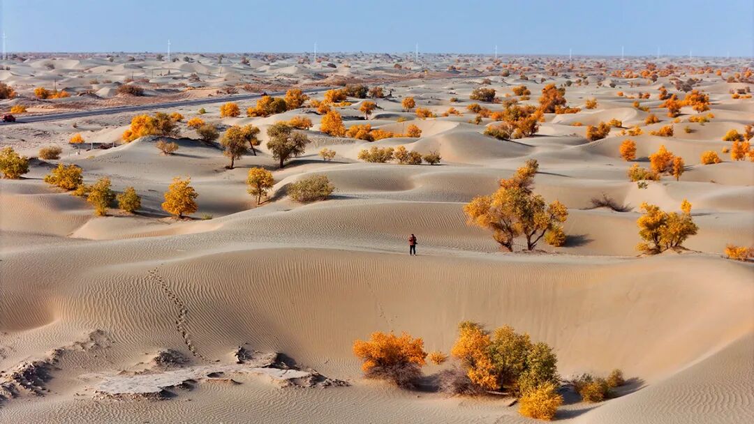 金秋10月,塔克拉玛干沙漠里的胡杨金叶婆娑,迎来了它最美的季节。中国冶金报记者 顾学超摄