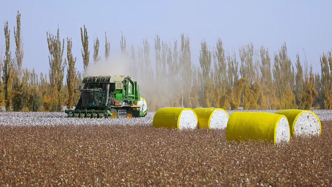 十月的新疆是收获的季节,在兵团一师管辖地,大型机械在收割棉花并打捆待运。赵树宴 摄