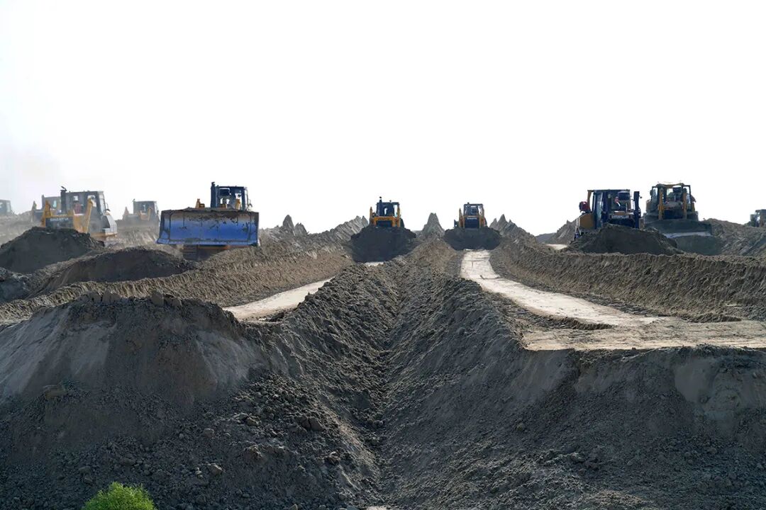 10月24日,第一师阿拉尔市塔里木河干流生态综合治理项目现场,数十台推土机依次排开平整土地。该项目自2021年启动以来,至今累计建设规模已超50万亩。 科普时报记者 季春红 摄