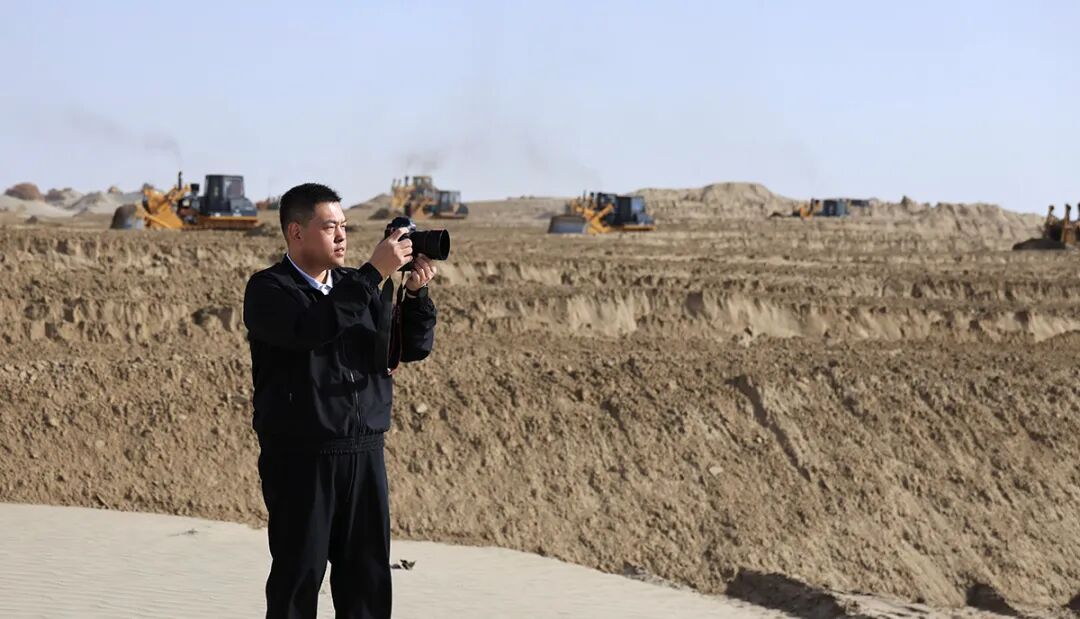 10月24日,中新社摄影部原副主任任海霞在塔河干流生态综合治理项目施工现场采访。中国冶金报记者 顾学超摄