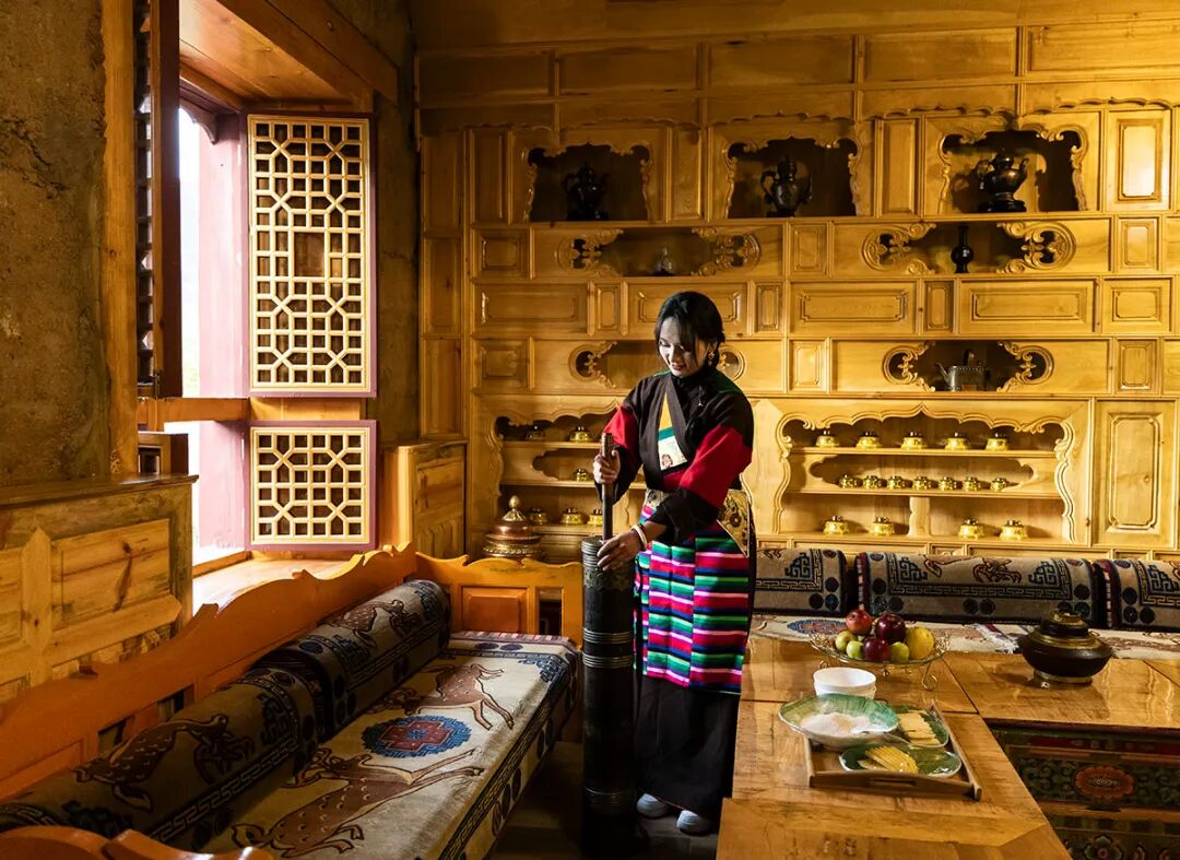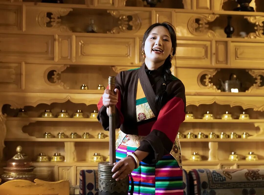 在乡城县博康噶布乡村民宿,一名藏族姑娘身着当地传统服饰“疯装”演示用传统方法打酥油茶。
