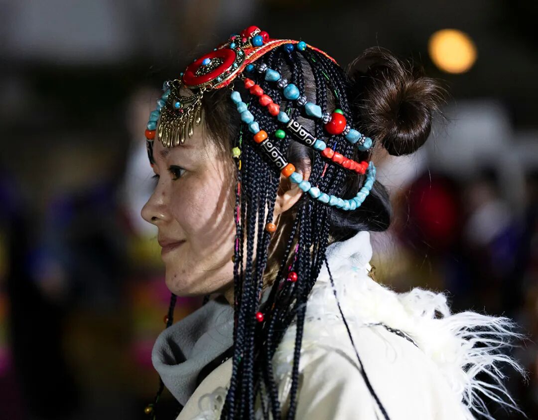 在乡城县博康噶布乡村民宿,身着传统服饰的当地居民围着篝火跳起锅庄舞。