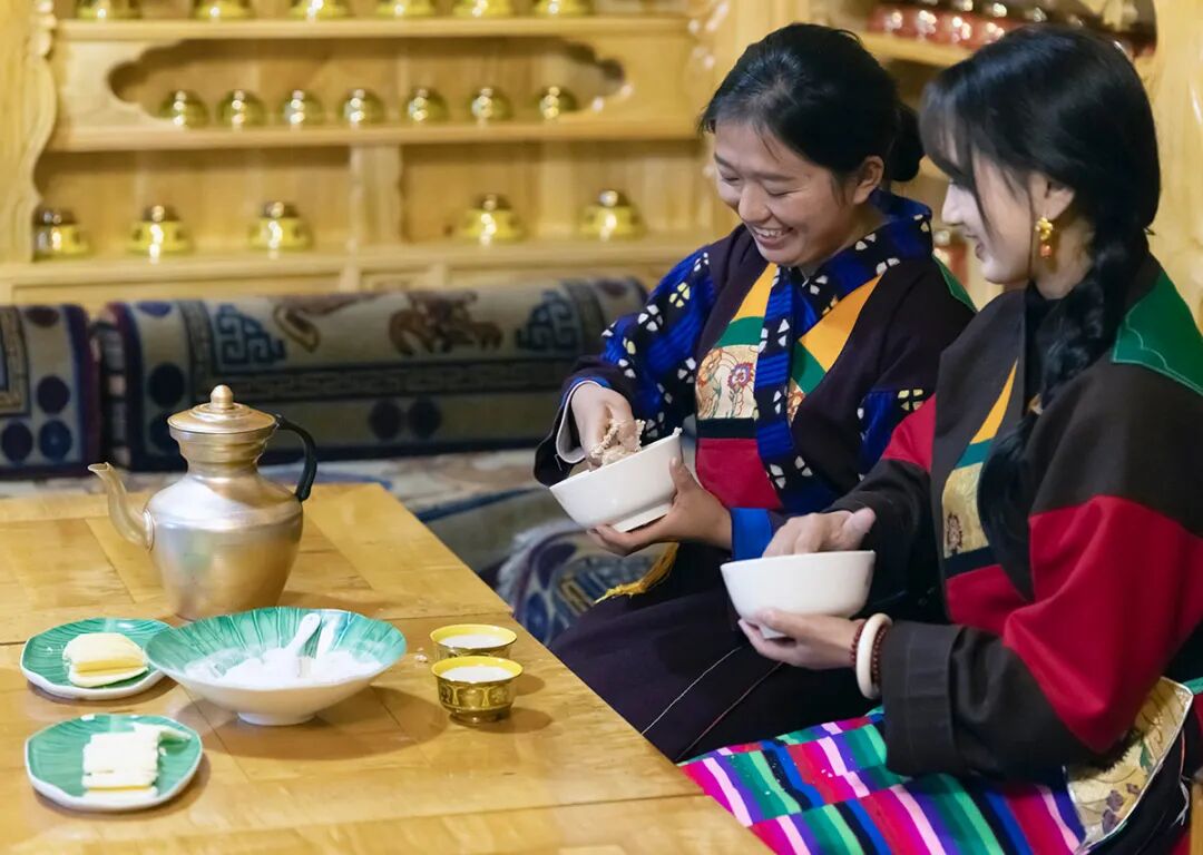 身着当地传统服饰“疯装”的藏族姑娘在乡城县博康噶布乡村民宿里喝酥油茶。