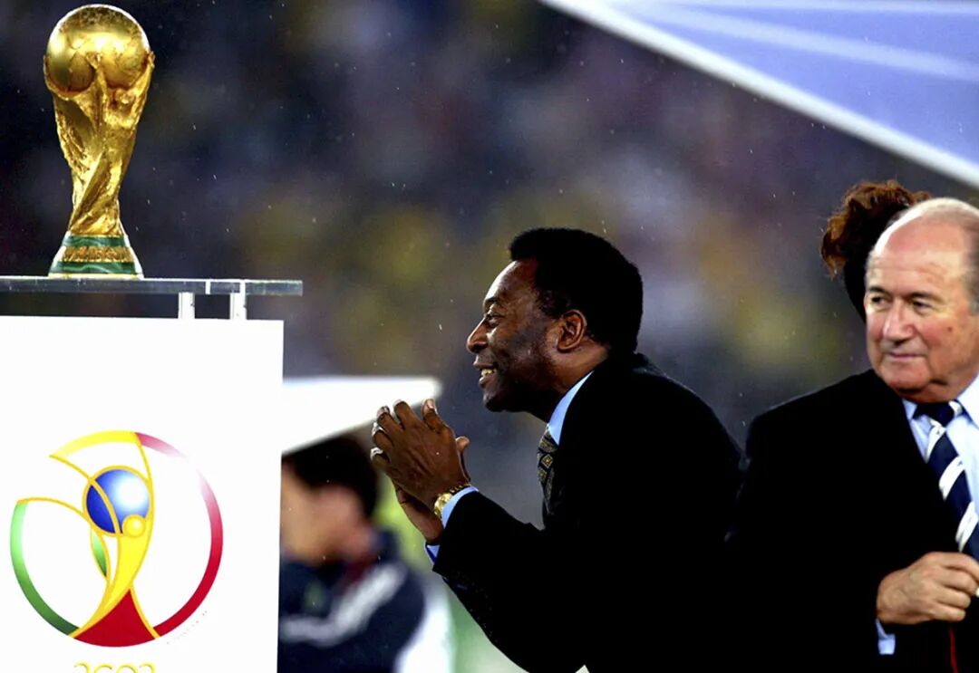 《贝利朝“胜”》2002年韩日世界杯冠军颁奖仪式上,球王贝利祈祷巴西队获得冠军。