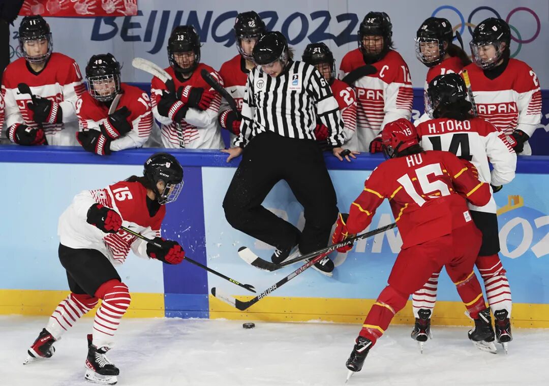 2022年2月6日,北京五棵松体育馆。在北京冬奥会女子冰球中国队与日本队的比赛中,双方展开了激烈的拼抢,最终中国队以2:1获胜。图为双方队员拼抢中逼迫裁判坐到挡板上