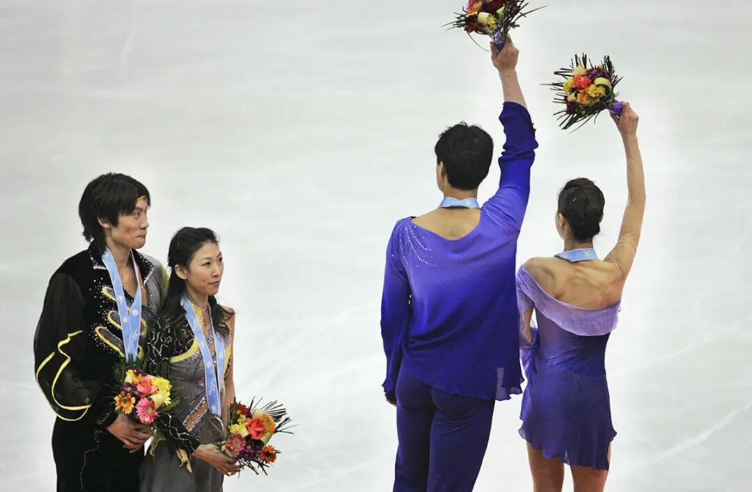 《望其项背》2007年2月3日晚,在长春举行的亚冬会花样滑冰双人滑颁奖仪式上,获得亚军的庞清/佟健用羡慕的目光注视着第四次获得亚冬会冠军的申雪/赵宏博。